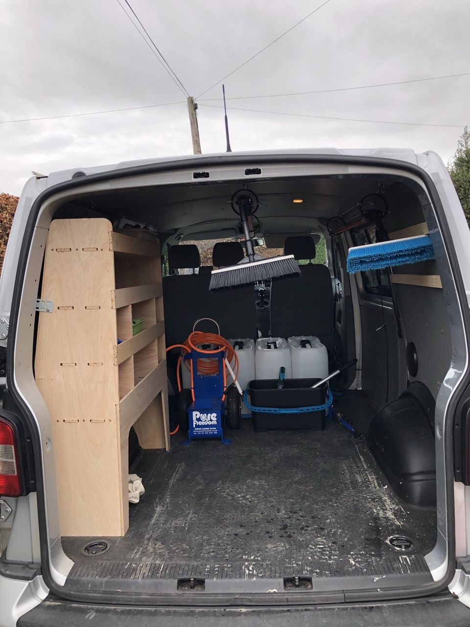 All kitted out and set up ready to start work on the first day of business. That’s two carbon-fibre water-fed poles, 21ft and an amazing 45ft reach, with brush heads attached. Great for reaching high windows and even solar panels and skylights on roofs. In the back of the van is my water trolley with a 100psi pump for getting the water right up to the heights of the pole system, and next to the trolley are eight 25litre water containers holding 100% pure water, produced in my home-based, DI resin filter system. The perfect system for producing great, streak-free, crystal-clear windows!